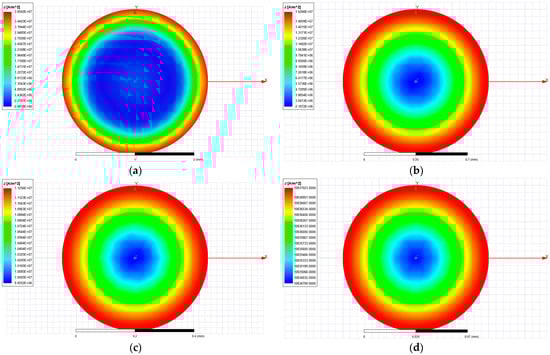 Skin effect at 100 kHz for different wire diameters: (a) 2.5 mm; (b) 1.0 mm; (c) 0.5 mm; (d) 0.1 mm.