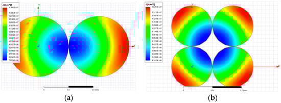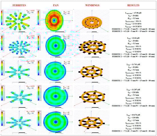 Since new-generation high-frequency induction cookers require lower-value passive components compared to their conventional counterparts, the inductance value of the induction coil is much lower. The number of windings was reduced to decrease the inductance value of the induction coil. Reducing the amount of winding is important for reducing copper losses and increasing efficiency, as well as reducing product costs. Since decreasing the winding value for the same load current value will reduce the magnetomotive force, the magnetic field value that occurs for the same number of magnetic cores is much lower. Reducing the number of windings also provides the opportunity to reduce the number of magnetic cores. The high number of windings in conventional induction coils increases the risk of magnetic saturation if the number of magnetic cores decreases. Reducing the number of magnetic cores along with the number of windings reduces the resistance value in the coil-pot equivalent circuit and increases the inductance. In the previous sections, the effect of the equivalent resistance value on power transfer was discussed in detail. To increase the equivalent resistance value, the air gap must be reduced. When the air gap is reduced, the equivalent inductance value decreases and the resistance increases. Reducing the air gap is essential to designing a thinner induction cooker. FEM analyses of induction coils designed for low-power applications are given in Figure 13.