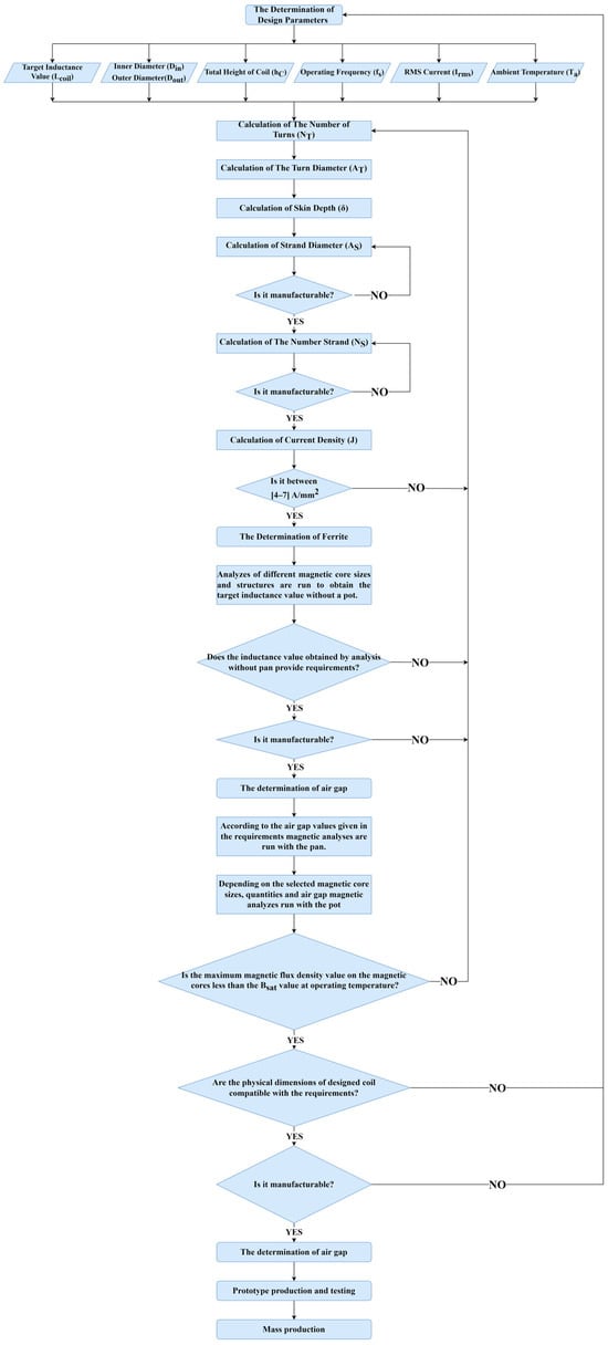 The litz wire structure preferred in induction coil design can be a problem for mass production due to its complexity in terms of production. Immediately after the design is completed, it should be updated in places where the manufacturer’s capabilities are examined in detail during the prototyping phase, particularly because not every manufacturer can produce multi- and thin-core litz wires. Similarly, the high-frequency magnetic cores to be used must be affordable and can be supplied in large quantities for mass production.