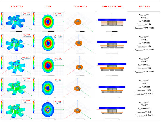 To design proper induction coils for domestic induction heating applications, a variety of FEMs were run. Some of the analyses were implemented following the FEM results. Firstly, the induction coil was designed for high-power applications. The target power rating was approximately 3.7 kW, which is widely used in mid-segment products. This application selected approximately 120 kHz switching frequency, which is nearly 5–6 times higher than conventional domestic induction heating applications. Conventional domestic induction cookers set the resonance frequency as approximately 18 kHz. Magnetic simulations were performed based on the fact that high-frequency induction cooktops operate between 100 and 120 kHz. In practical measurements, the operating frequency was approximately 100 kHz. As the switching frequency increased, it was obvious that the values of the passive components used in the power circuit decreased compared to conventional systems using low resonance frequency. FEM analyses of induction coils designed for high-power applications are given in Figure 12. In these analyses, in addition to conventional induction cooker coils, analyses of their high-frequency counterparts are also included. Results are given for different windings and magnetic core numbers, as well as for different air gaps. All of these analyses were carried out for a 210 mm induction coil and with a cast-iron pot. Cast-iron pots are made from a metal base plate through which induction cookers can transmit maximum power and have high induction compatibility.