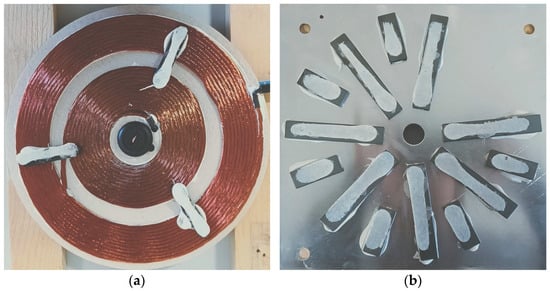 Induction coil used in conventional domestic induction cooktops: (a) windings; (b) magnetic cores.