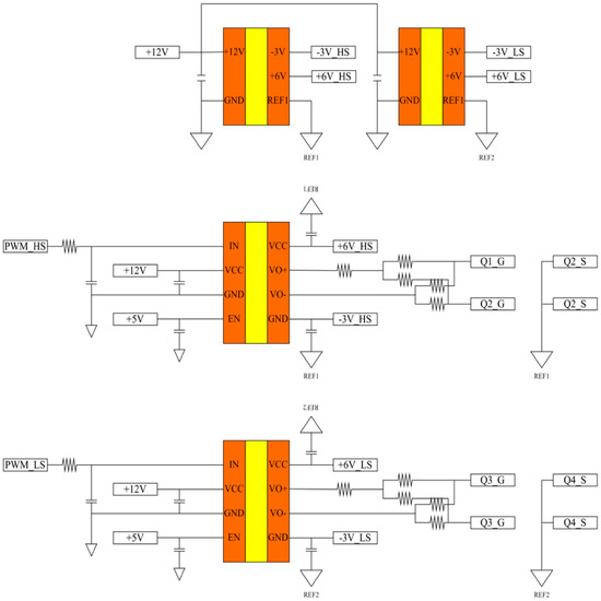 In the gate drive circuit, an isolated driver was preferred. The secondary side of the gate drive was provided by an isolated DC-DC converter. In order to prevent parasitic turn-on and turn-off, the gate signals were kept at a negative voltage.