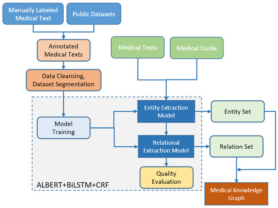 Figure 1 depicts the steps taken. Firstly, medical texts with annotations are obtained from public datasets and manually labeled. Then, those are preprocessed to remove some special symbols and check the accuracy of the annotation format. Next, the whole dataset is split into three, for training, validation, and testing, respectively. The ALBERT+Bi-LSTM+CRF algorithm is used for training. A large number of medical texts or medical guidelines can be embedded into the proposed algorithm as inputs to generate predictions after the algorithm is evaluated and adjusted. Afterward, a structured entity set and relationship set are obtained. These data are organized and fused to form a ternary group after duplicates are removed. Finally, the database of a knowledge graph is constructed.