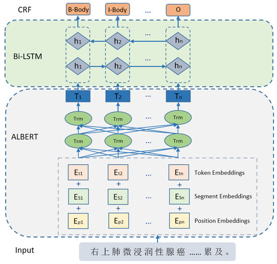 The training model consists of three parts, ALBERT, Bi-LSTM, and CRF. Figure 3 depicts the model structure. The text is first embedded into ALBERT to extract features, providing a hidden-state representation of a sequence after multiple embeddings are run. Then, the Bi-LSTM layer captures the long-distance dependencies in the sequence according to the output of ALBERT. Finally, the CRF layer performs sequence labeling and outputs the labeled results in the BIO format. To categorize named entities, each entity is assigned to a label, namely, B-X, I-X, or O. B-X signifies that a given word is categorized under class X and is positioned at the start of the entity. I-X denotes that the word belongs partially to the category X, but it appears in the middle of the entity’s span. O signifies that a word is not associated with any of the categories.