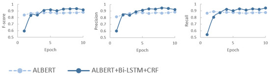 Since strict requirements for accurate data apply in the medical field, BiLSTM and CRF were introduced to construct a more refined algorithm. As shown in Figure 4, although the proposed algorithm performed relatively poorly in the early stages of training, it succeeded in producing a better outcome within an acceptable time frame if the training cycle was appropriately extended. Specifically, the F1-score, precision, and recall of the ALBERT+BILSTM+CRF algorithm reached 91.8%, 92.5%, and 94.3%, respectively. When ALBERT was compared with the proposed algorithm, the F1-score, precision, and recall increased by 1.3%, 5.3%, and 4.7%, respectively.