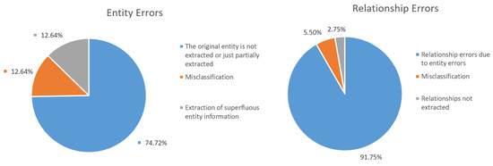 (1) The original entity is not extracted or just partially extracted: This is the most common type of error in entity extraction and is often encountered with more complex entities that have complete sentence structures, including punctuation marks or conjunctions, for example, “and.” The model tends to break down these entities into smaller units. Due to the low absolute number of such complex entities and the difficulty in finding similarities among them, the learning performance of features in the model is suboptimal.