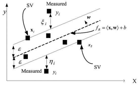 Support vector regression (SVR) is a nonlinear regression method based on support vector machines (SVM) [33,34]. It aims to construct a hyperplane that reduces the prediction errors and maximizes the margin between the hyperplane and the closest data points. An epsilon tube is used to define acceptable error boundaries. The algorithm applies a kernel function to project the input data into a higher-dimensional feature space, allowing for the creation of the hyperplane and the minimization of errors in this new space. The structure of SVM regression is illustrated in Figure 2.