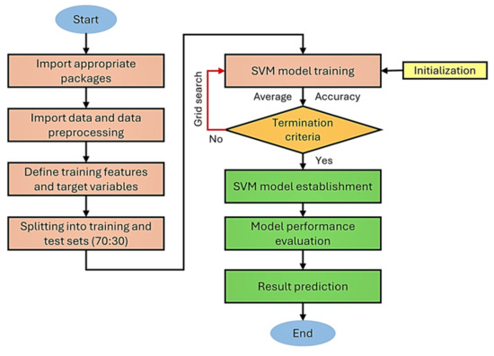 where represents the classes, and denotes a set of features. The parameter b corresponds to the width of the hyperplane, and W signifies the margin. To handle situations where the constraints become infeasible, slack variables and are introduced. The parameter C is used to achieve a trade-off between the width of the margin and the degree of misclassification, effectively controlling the balance between achieving a wider margin and allowing some errors in classification. The process of building an SVM can be visualized through the flow chart presented in Figure 3, which outlines the steps involved in training and predicting the model.