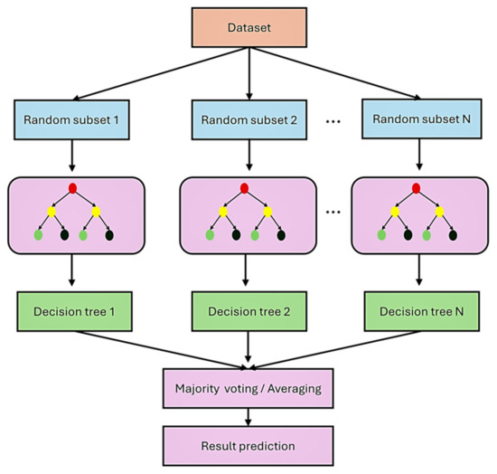 Random forest regression (RFR) is a supervised learning algorithm that falls within the ensemble learning family and is utilized for tasks such as regression and classification [35]. During the training phase, numerous decision trees are created. Each decision tree in the forest is constructed using a random subset of the training data and features, promoting diversity and reducing overfitting. The final output from RFR is obtained by averaging the predictions made by each tree, which enhances the accuracy and robustness. This method capitalizes on the strengths of multiple models to produce a more reliable and stable prediction compared to a single decision tree, as shown in Figure 4. RFR is widely favored for its simplicity, versatility, and superior performance in handling complex datasets and capturing non-linear relationships.