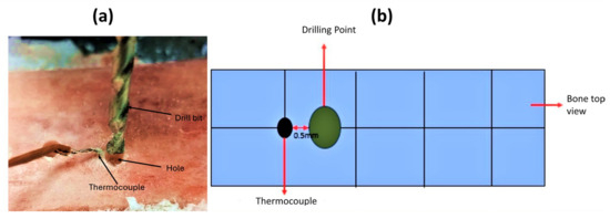 (a) Illustration of bone drilling site and (b) schematic diagram of thermocouple location from the drilling site.