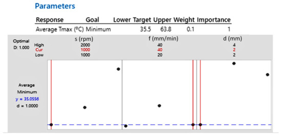 The Response Surface Methodology (RSM) optimization technique was implemented to determine the optimal combination of input variables, such as the spindle speed, feed rate, and drill diameter, which resulted in the lowest feasible process temperature. Figure 6 illustrates the optimization procedure that was designed to consider the model’s predicted minimum process temperature and desirability constraints. The red color represents the optimization input, the blue color indicates the predicted outcome of the experiment, and the black dots correspond to the level of each parameter as shown in Figure 6. The results of the validation process, which encompass a thorough comparison with the experimental data, are comprehensively presented in Table 3. Notably, the model exhibits a remarkably low error rate of just 0.45%, underscoring its exceptional accuracy and reliability.