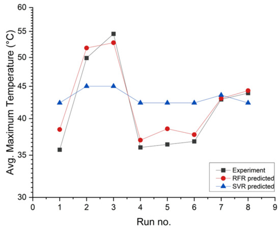 The temperature values for bone drilling were derived from 27 experiments utilized for both training and testing. Table 4 displays the varied predictions from the support vector regression (SVR) and random forest regression (RFR) models. Table 5 lists the testing and training errors, assessed using three performance indicators to gauge the prediction accuracy.