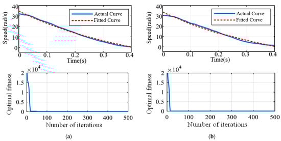 Through two repeated experiments, the relationship between the motor speed and time during the power-off deceleration process was measured, and its curve was fitted by PSO. The results are shown in Figure 3. The coefficients were calculated by bringing the above test results into Equation (5). And these coefficients were deformed to obtain the parameters to be identified. Let the identification coefficients Tc/Bv, θ0, and Bv/Jm be denoted as a, b, and c, respectively. The formula for solving the friction parameters is given in (6), and the results are presented in Table 2.
