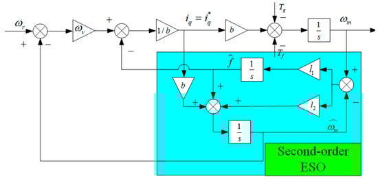 A simulation was conducted on the speed loop control based on the second-order extended state observer (ESO), aiming to assess the disturbance observation effects. The control diagram is depicted in Figure 6. Under no-load conditions, a step speed command of ωr* = 30 rad/s was applied. It was observed that the motor speed was able to track the actual speed, stabilizing around 0.2 s after an overshoot. The friction torque, as an expanded state variable, eventually converged to the actual value. However, during the speed ramp-up phase, the observed values failed to track the real-time changes in friction torque. For applications requiring high dynamic response, it might be beneficial to also treat the dynamic response as an expanded state in the system, thus increasing the order of the ESO to reduce the observation error [21].