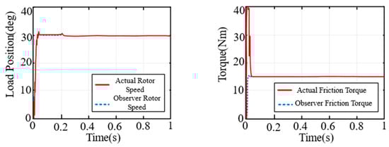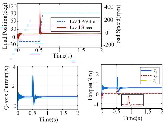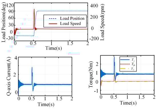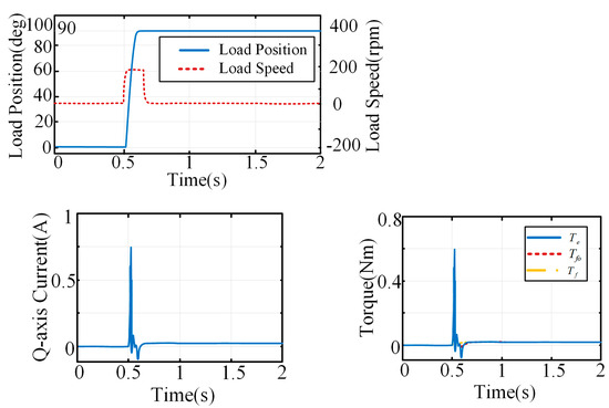 At 0.5 s, a 90-degree step position signal was introduced. Subsequent analysis delineated the system responses and friction torque manifestations under varying conditions, specifically the no-load and 20% rated load scenarios, which are presented in Figure 10 and Figure 11. Notably, the incurred steady-state errors amounted to 0.01° and 0.001°, respectively. This observation result underscores the mitigative influence of loading on the system, a phenomenon corroborated by prior scholarly discourse. The utilization of a second-order extended state observer (ESO) engenders a discernible delay in the observation of friction torque, a feature congruent with theoretical conjecture.