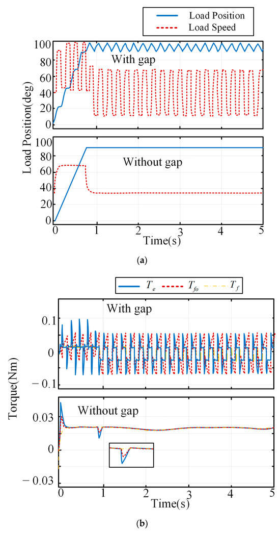 System response with LADRC loop controller. (a) Load position and rotational speed. (b) Friction torque, observed torque, and electromagnetic torque.