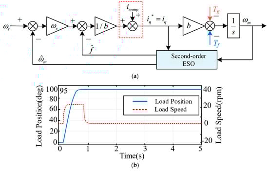 Block diagram of improved LADRC speed loop control and system response. (a) Control block diagram. (b) Load position and rotation speed.
