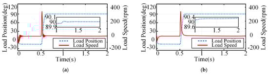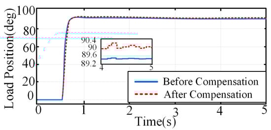 A 90° step position signal was applied at 0.5 s, and Figure 14 compares the load positions before and after compensation. The maximum steady-state errors were 0.19° and 0.55°, respectively, indicating an improvement in the positioning accuracy.