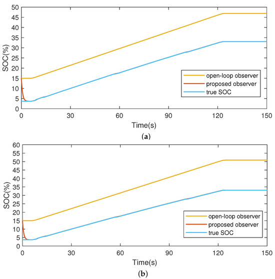 Comparison of SOC estimation performance during dynamic charging with capacitance variations. (a) SOC estimation with capacitance variations. (b) SOC estimation with capacitance variations.