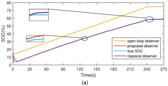 As shown in the Figure 10, in both experiments, the open-loop observer’s error is unacceptable, while both the Kalman Filter and the proposed observer exhibit stable performance. Although both converge to the actual SOC when charging stops, there are still some performance differences.