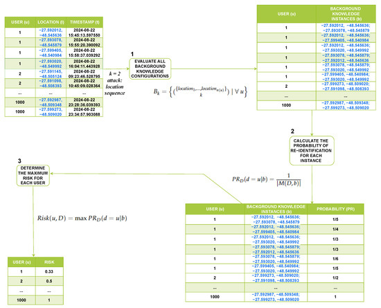 A background knowledge category refers to information known by an adversary about the specific dimensions of an individual’s data. For instance, in mobility data, typical dimensions include space, time, frequency of visiting a location, and probability of visiting a location. The number of elements the adversary knows, the size of the background knowledge configuration, is denoted by k. An example of a background knowledge configuration could be the adversary knowing points in the trajectory of an individual. An instance of background knowledge represents specific information the adversary knows, such as a visit to a specific location; we can see an example of background knowledge in Figure 1. In Figure 1, we begin with a dataset containing trajectory data. In the example provided, the attacker has knowledge of location sequences, with a knowledge size of 2. The second table in Figure 1 illustrates the background knowledge instances generated from the input dataset. Location information is combined in pairs (two by two) to represent the potential knowledge an attacker might possess.