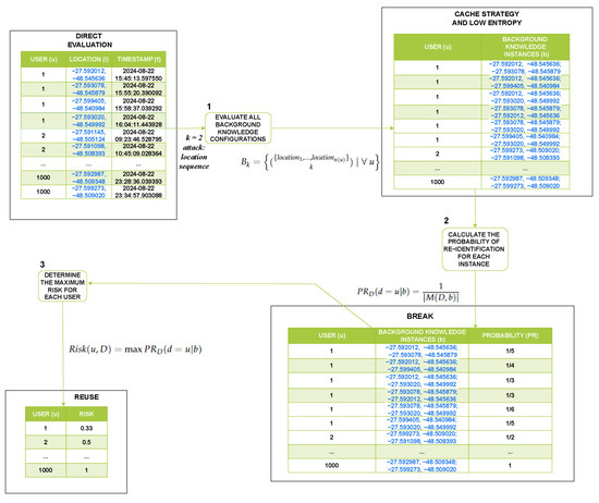 This section proposes improvements within the PRUDEnce framework, particularly on computing privacy risk assessment. As illustrated in Figure 3, we introduce several advancements: Low Entropy, Cache Strategy, Break, Direct Evaluation, and Reuse. Each of these techniques targets a specific aspect of the privacy risk assessment process. The Low Entropy approach reduces the number of instances that require re-identification probability evaluation. The Cache Strategy stores instance information in memory, minimizing redundant calculations. The Break method stops the evaluation once an instance with maximum risk is identified. Direct Evaluation bypasses risk computation when the trajectory contains any feature with unique information. Finally, the Reuse technique applies the privacy risk evaluation from the analysis to the current k analysis if the previous risk is already at its maximum.