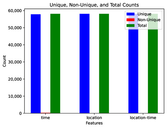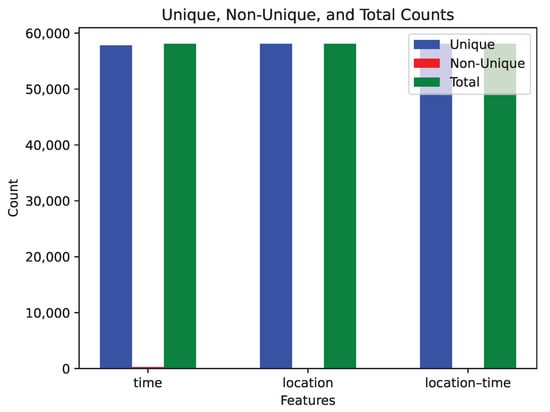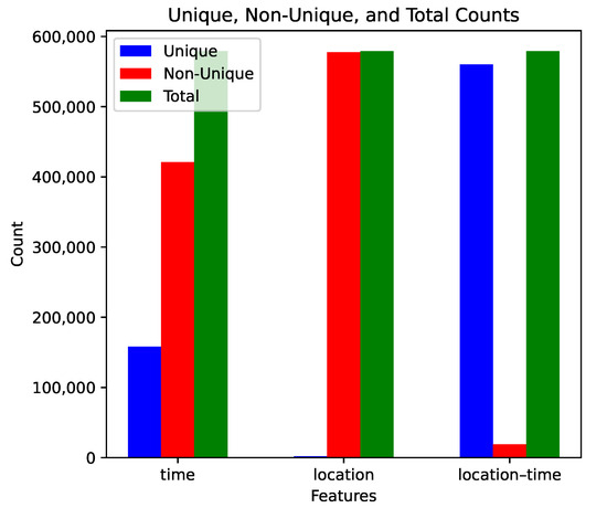 Regarding entropy, low-frequency features contribute less to the overall uncertainty in the dataset because their probability of occurrence is low. In entropy calculations, probabilities of rare events (e.g., visits to low-frequency locations) have less impact on the overall entropy than probabilities of more common events. Therefore, low-frequency features tend to have lower entropy, indicating less uncertainty in the distribution of visits. While low-frequency features may be easier to predict due to their less variable and more predictable nature, this predictability can increase the risk of re-identification.