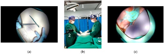 The self-constructed damage control surgery database of the research group provided a closure of the abdomen simulation surgery dataset for this study. This dataset was created by nine surgeons, including three practicing physicians, three resident interns and three clinical undergraduates. Each surgeon performed five simulated surgeries on a mannequin, resulting in a total of 45 video recordings. These data were collected using three different devices, as illustrated in Figure 1b. In the figure: 1 represents the surgical lamp coaxial camera, which captures third-person perspective surgical video data with a field of view aligned with the surgical lamp’s light field; 2 represents the Kinect depth camera, positioned beside the operating table to capture third-person perspective video data; 3 represents a head-mounted camera worn by the operating surgeon, capturing first-person perspective video data as the view changes with the surgeon’s head movements. The basic parameters of the equipment used for data collection are listed in Table 1. Due to the stable field of view provided by the surgical lamp coaxial camera—without the jitter issues of the head-mounted camera and the limited field of view of the Kinect camera—this study used video data captured by the surgical lamp coaxial camera. The videos have a frame rate of 30 fps, a resolution of 1200 × 720 and a duration ranging from 2 min 42 s to 5 min 22 s. All operations were performed on simulated organs, which were connected to a surgical manikin. The closure of the abdomen simulation surgery used a standard interrupted suture technique, requiring surgeons to use a needle holder to grasp the needle and suture the abdominal opening step by step. Figure 1 shows example video frames (a), the surgical scene (b) and the surgical manikin and simulated organs (c) from the closure of the abdomen simulation surgery.