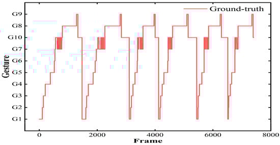 In this paper, the model is tested on two ways of recognition, hence the dataset was processed twice. First, we performed preprocessing by randomly selecting 3 complete videos from the 45 video datasets to evaluate the frame-wise accuracy of online recognition. For the remaining 42 videos, we segmented them according to predefined boundary frames and manually extracted action segments of each gesture category, known as gesture instances. Subsequently, we divided the gesture instances of these 10 gesture categories into training, validation and test sets in a ratio of 0.64:0.16:0.2. For each gesture instance, we uniformly sampled at least 32 frames. If the number of frames for a gesture instance was less than 32, we opted to duplicate the last frame to fill the sequence to 32 frames, rather than discarding these instances. Ultimately, the numbers of instances in the training, validation and test sets were 1948, 491 and 615, respectively.