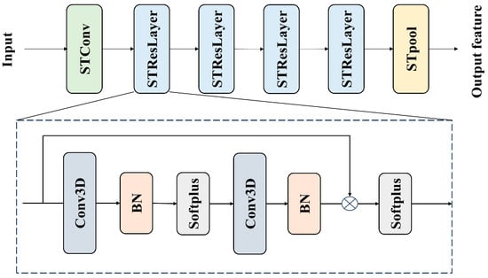 The proposed R3D-MHA model has a modular structure, composed of the R3D module and the multi-head attention mechanism module. The first part involves using the R3D module as the backbone network to extract spatiotemporal features from video sequences. The R3D model is a 3D-CNN extended from the ResNet architecture, with a structure similar to 2D ResNet but replacing 2D convolutions with 3D convolutions, and using a 1 × 3 × 3 convolutional kernel in the temporal dimension. As shown in Figure 3, the main structure of the R3D network includes an STConv layer, four STResLayer layers, and an STPool layer. The STConv layer uses a standard 3D convolution module to extract features with a kernel size of 3 × 7 × 7. The STResLayer is composed of a basic residual module, as depicted in Figure 3, which consists of two 3D convolutional layers, each followed by a BatchNorm layer and a Softplus layer. Additionally, the STPool layer uses AdaptiveAvgPool3d to dynamically adjust the pooling layer size. Notably, in this study, all activation functions in R3D were replaced with Softplus instead of ReLU, enabling more effective weight updates and improving the model’s generalization capability.