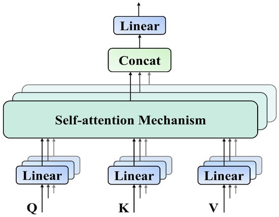 The second part uses a multi-head attention mechanism module to further process the extracted features. It first performs three linear transformations on the input feature data, mapping the input (X) into matrices representing the query (Q), key (K) and value (V), respectively. Then, according to the following Equation (1), it calculates the attention weights for each head. , where () is the dimension of the attention head, and (, , ) are the weight matrices learned by this head. Finally, multiple attention heads are used to compute attention weights in parallel to obtain multiple output results. These outputs are then linearly transformed and concatenated as shown in Equation (2) to obtain the final multi-head attention representation. Figure 4 is the schematic diagram of the multi-head attention mechanism.