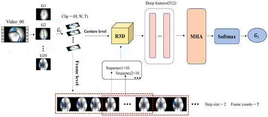 Figure 5 illustrates the overall technical framework of this paper. We conducted two different experiments where the R3D-MHA model had two different inputs. For offline recognition, we performed evaluations at the gesture level by inputting the processed 32-frame (T = 32) images into the R3D model to generate 512-dimensional deep features. Subsequently, the multi-head attention module conducted relevance learning on the deep features, and ultimately generated gesture labels  at the gesture level using Softmax. For online recognition, we input the processed 16-frame overlapping segments, but this paper does not focus on the results of the segment-level test set. We trained the model by inputting overlapping segments and then evaluated the frame-wise accuracy of online recognition on three complete videos.