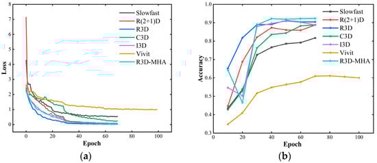 Each set of experiments was assigned the same random seed number to ensure reproducibility of the results. All models were fine-tuned on our self-built dataset without using pre-trained models. All model codes in the experiments were written based on the PyTorch framework, and the experiments were run in an RTX 3090 (24219MiB) GPU environment. All experiments were set to 70 training epochs, except for the Vivit model which was trained for 100 epochs. The batch size was set to 16, the optimizer used was SGD, the learning rate was set to  and the loss function was the cross-entropy function.