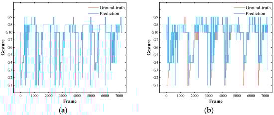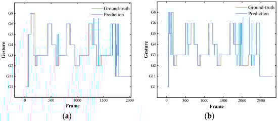 For the online recognition task, we performed online inference using the R3D-MHA model on three reserved full-length videos. We processed the videos with a sliding window of 16 frames and a step size of 1 frame, meaning the recognition of the n-th frame was based on the information from frames [n − 15, n]. No future frames were provided to the model during the experiment to ensure this method’s applicability to online gesture recognition, performing real-time gesture recognition based solely on existing video information. Table 6 presents the frame-wise accuracy (FWA) and average results of the three full-length videos. We compared the online recognition results of the R3D model and found that the R3D-MHA model improved the frame accuracy by 0.4% in the online recognition task. Additionally, we presented visualized recognition results of the R3D-MHA model on the best- and worst-performing videos, as shown in Figure 7. The blue line represents the predicted values, and the red line represents the ground truth. The more the prediction overlaps with the ground truth, the higher the prediction accuracy. From the figure, it can be seen that although there are some error fluctuations in recognizing transitions of the doctor’s actions, since we trained a classification model rather than a segmentation model, the R3D-MHA model can still accurately identify the doctor’s gesture transitions, demonstrating its potential for online recognition applications.