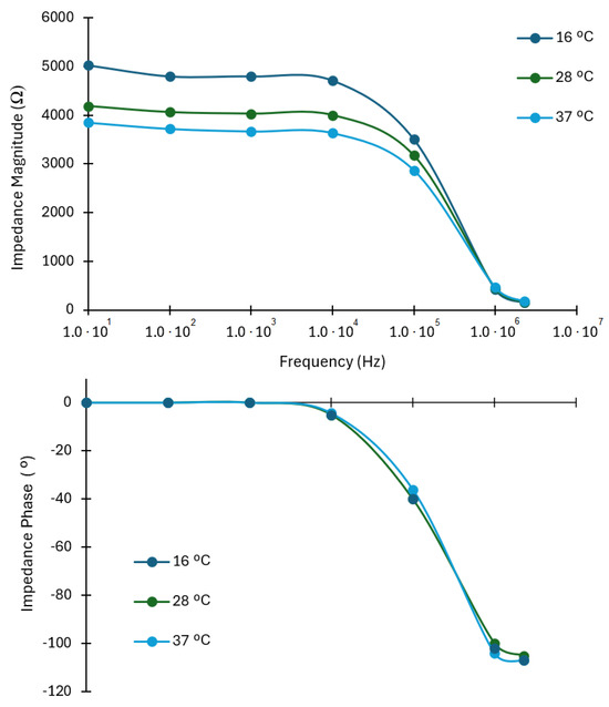 In Figure 8, Figure 9 and Figure 10, the behaviour of the phase of impedance at different temperatures and with increasing frequency is also represented. The mean values obtained from all impedance phase measurements were , , and for temperatures of 16, 28, and 37 , respectively. The highest phase impedance value was found at 37 and the lowest at 16 , both at Hz.