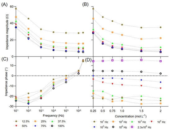 Impedance measurements in saline solution at different concentrations and frequencies. The 100% NaCl solution corresponds to a concentration of . (A) Impedance magnitude concerning frequency, and (B) Impedance magnitude concerning molar concentration. (C) Impedance phase concerning frequency, and (D) Impedance phase concerning molar concentration.