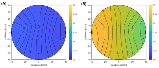 Representation of the equipotential lines in saline solution at a frequency of Hz and concentrations of (A) 100% and (B) 12.5%; the black points indicate the measurement electrode locations and the rectangles at the opposite borders are the current injection electrodes.