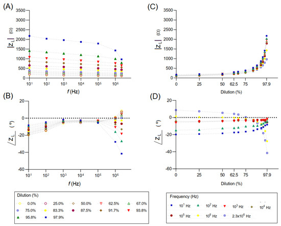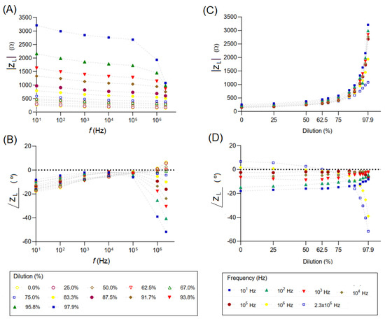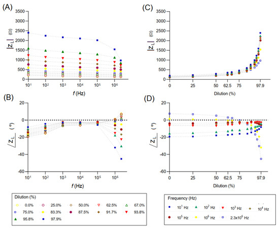 Adulterated milk impedance measurements at . Frequency response is shown in (A,B). The effect of water dilution on the complex impedance is emphasised in (C,D).