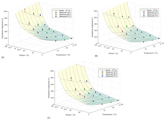 Table 5 presents the statistical parameters of the proposed mathematical models from the experimental measurements for the frequencies , , and Hz, i.e., low, medium, and high frequency and Equations (3)–(5) are, respectively, the mathematical models to predict the impedance magnitude as a function of temperature (T) and dilution (D). Figure 7 presents the regression surfaces of the models. The possibility of using mathematical models is important because if there is a correlation of factors, a methodology can be proposed to identify adulteration by these substances from these models [18].