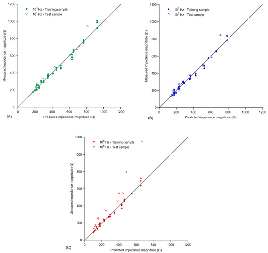 Measured impedance values to predict impedance values using the proposed mathematical modelling and measured test frequencies: (A) , (B) , and (C) Hz. The straight line represents the ideal relation between the measured impedance and the respective impedance value predicted by the proposed mathematical models.