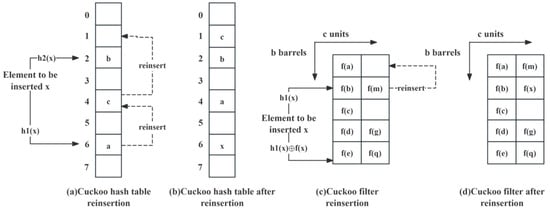 A cuckoo filter is an approximate membership test data structure based on cuckoo hashing [,,,,,]. Unlike the traditional cuckoo hash table, the cuckoo filter improves on the storage strategy by saving space by not storing the complete elements but only keeping the fingerprint information of the elements. The architecture of this design enables a substantial reduction in the necessary storage space for cuckoo filters while concurrently sustaining a high level of query performance. However, the reliance on fingerprint data for element identification within the cuckoo filter does introduce a potential for misclassification. Specifically, there exists a risk that elements not actually present in the filter might be erroneously recognised as existing members. Despite this possibility, the rate of such errors is controllable and is confined within established theoretical limits.