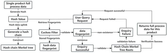 Considering the storage cost associated with storing all the data on the chain, the ECMI model adopts an efficient strategy: only the hash values obtained by hashing the full-process data of a single product are stored. These hash values are further processed through the cuckoo filter to generate data fingerprints, which are stored in the cuckoo filter. Meanwhile, the uplinked block data consist of these hash values to form a hash chain, and the corresponding hash chain Merkle tree is constructed based on this. The hash values that are stored on the blockchain are organised into a hash chain, which is a series of linked hash values that represent the data’s journey from their origin to the current state. From these hash values, a Merkle tree is constructed. This tree structure is fundamental for the blockchain’s ability to verify data integrity efficiently. The Merkle tree allows for the validation of data without the need to process the entire dataset, thus saving computational resources and time.