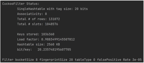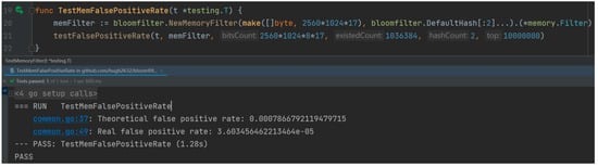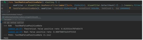 The compilation and testing of this experiment was carried out under Windows system; the specific configuration of computer hardware and software is shown in Table 1. The code execution result of the cuckoo filter algorithm is shown in Figure 4, which is implemented in Go language and compiled and tested using goland compiler. In the experiment, we set the bucket size to 8 and the fingerprint length to 20, and we stored more than one million elements. The elements stored in the experiment were randomly generated data in Go language and hash values of 32-byte size obtained after hashing operation. Under these parameter configurations, the actual storage space occupied by the cuckoo filter is 2560 KB, while the original data, i.e., 106 32-byte hash values, has an actual storage space of about 31,250 KB. Through the efficient data compression mechanism of the cuckoo filter, the data storage space was significantly reduced to 8.192% of the original data storage space, which significantly reduced the storage requirements.