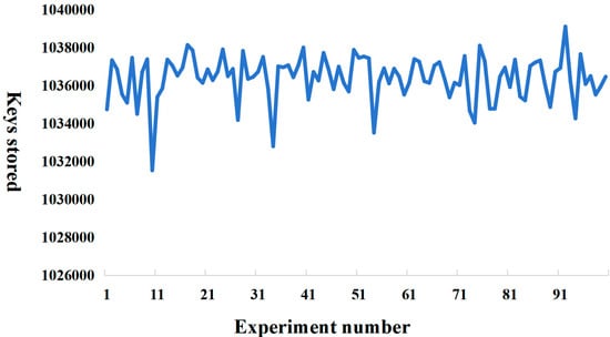 Figure 6 illustrates the results of the Bloom filter running with the same fixed parameter settings for k = 2. Specifically, the Bloom filter inserted n = 1,036,384 storage elements, performed 10 million query operations, and operated on 2560 KB of storage. Figure 7 then shows the false positive rates of the Bloom filter and the cuckoo filter in one hundred independent experiments and calculates the arithmetic mean of their respective false positive rates. The Bloom filter had a false positive rate of 8.75 × 10−3, and the cuckoo filter had a false positive rate of 3 × 10−5. Based on the above data, it was calculated that the probability of a false positive for the Bloom filter was approximately 292 times higher than the probability for the cuckoo filter. Accordingly, it can be concluded that the false positive rate of the cuckoo filter is significantly lower than that of the Bloom filter under the same experimental conditions. Further, considering the continuous growth of the data volume in practical applications, the Bloom filter usually has two solutions in order to maintain a low false positive rate: The first solution is to increase the k value, i.e., to expand the hash function library of the algorithm, but in practical applications, this solution is more difficult to implement, and it is difficult to ensure the continuous expansion of the hash function, so this solution is discarded. The second scheme is to reduce the false positive rate by increasing the storage space. Based on this, this paper further carried out experiments on Bloom filter storage space expansion.