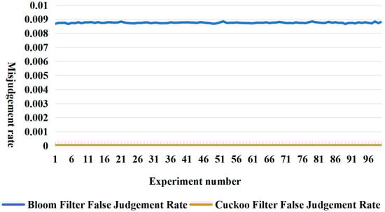 In this experiment, since the actual number of elements stored in each cuckoo filter was variable, in order to ensure the scientificity and validity of the subsequent experiments, this paper adopted the arithmetic average of the number of stored elements in one hundred experiments of the cuckoo filter as well as the misjudgement rate as the parameter values of the Bloom filter implementation function, where the actual stored element n was about 1,036,384 and the misjudgement rate p was 3 × 10−5. The experimental results are shown in Figure 5. Further, in order to achieve the same misjudgement rate p = 3 × 10−5 in the Bloom filter as in the cuckoo filter, the number k of the Bloom filter’s hash function was computed for the theoretical case given the number of data elements n = 1,036,384.