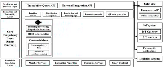 As shown in Figure 10, the architecture of the hairy crab traceability platform proposed in this paper is shown. The architecture is hierarchically divided according to functional requirements, including the blockchain foundation layer, the core capability layer, the regulation and traceability layer, and the application and interface layer. In the blockchain foundation layer, this system adopts an open source project as the underlying architecture in order to build a traceability application platform that is both secure and efficient. This layer provides a series of basic capability services, including user authentication, data encryption, consensus mechanism, and the operating environment of smart contracts, providing a solid basic capability service for the entire traceability system. The core capability layer is responsible for providing the execution environment of smart contracts and strictly verifying the data before uploading to the chain to ensure that all information meets the preset contract standards. Based on the established smart contract, this layer automatically executes relevant algorithms and refuses to uplink data that do not meet the specifications, thus ensuring the accuracy and compliance of the data. The supervision and traceability layer assumes the key role of data management and platform configuration and realises functions such as user login, channel management, smart contract release and upgrade, and transaction and query. This layer not only ensures the flexibility and scalability of the platform operation but also provides regulators with the necessary tools to achieve the effective monitoring of the entire traceability process. Finally, the application and interface layer serves as a bridge for the interaction between the system and the outside world, providing functions such as the management of breeding bases, the querying of product traceability information, the integration and display of IoT data, and integration interfaces with external systems. This layer unifies the access points of external data and provides traceability information services externally, enabling consumers, regulators, and other relevant parties to conveniently access the whole life cycle information of hairy crabs.
