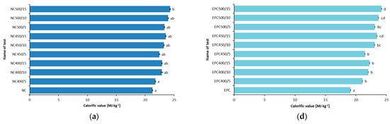 According to the Duncan test results, statistically significant differences in the calorific value were noted between the control sample and biochars for evening primrose cakes, milk thistle cakes and hemp cakes. In the case of the remaining three types of cakes, statistically significant changes were noted between the control sample and biochars obtained at the highest temperature and the longest time. In most cases, the change in the temperature and time of pyrolysis did not affect a statistically significant change in the calorific value between pyrolysates.