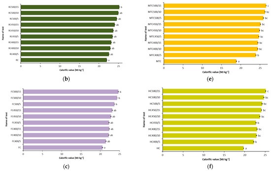 Calorific value of the tested cakes and biochars prepared from (a) fennel flower (Nigella sativa L.), (b) rapeseed (Brassica napus L. var. Napus), (c) flax (Linum usitatissimum L.), (d) evening primrose (Oenothera biennis L.), (e) milk thistle (Silybum marianum L. Gaertn.), (f) hemp (Cannabis sativa L.).