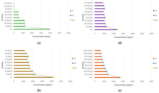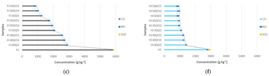 Comparison of emission parameters of tested cakes and biochars: (a) fennel flower (Nigella sativa L.), (b) rapeseed (Brassica napus L. var. Napus), (c) flax (Linum usitatissimum L.), (d) evening primrose (Oenothera biennis L.), (e) milk thistle (Silybum marianum L. Gaertn.), (f) hemp (Cannabis sativa L.).