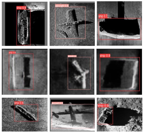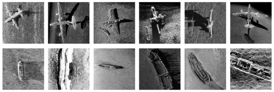 Currently, publicly available side-scan sonar image datasets are significantly fewer and smaller in scale compared to datasets in other target detection fields. Therefore, this study uses the openly accessible KLSG side-scan sonar image dataset for relevant research. The KLSG dataset includes two categories, ships and aircrafts, with a total of 447 images. Among them, there are 395 ship targets and 62 aircraft targets. The network generates 2430 augmented images. The augmented images, in conjunction with authentic SSS images, are utilized in the comparative experiments. Model training is carried out using an Intel(R) Core(TM) i5-13500H CPU and a 6 GB NVIDIA GeForce RTX 4050 GPU. The software compilation environment consists of PyTorch 2.1.2, CUDA 11.8, and Python 3.11.7 on a Windows 11 system. Figure 6 displays a portion of the dataset used for this study.